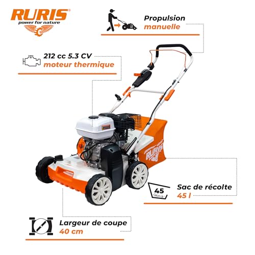 - Moteur essence 4 temps 212ccm de cylindrée avec 4.5kW (6.12PS) à 3.000 tr/min - sac collecteur : 50 litres - Réservoir de carburant : 3,6 litres - Rouleau de verticoupe / scarification : 16...