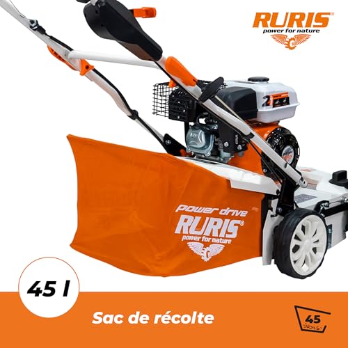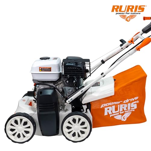- Un très grand sac de ramassage amovible de 50 litres, un réglage central de la hauteur de scarification, un démarrage facile avec starter et régulation du régime moteur ainsi qu'un carter...