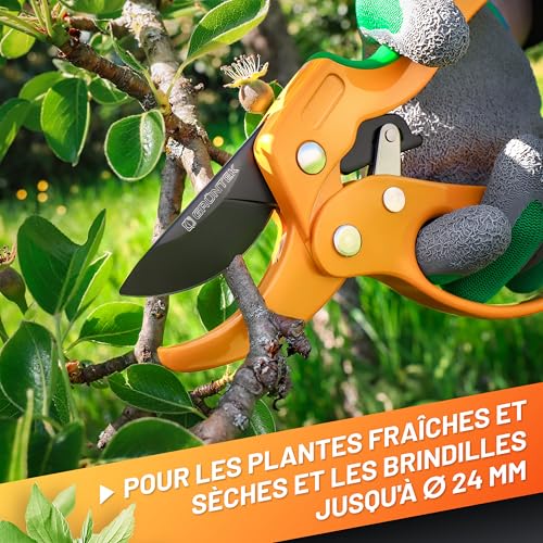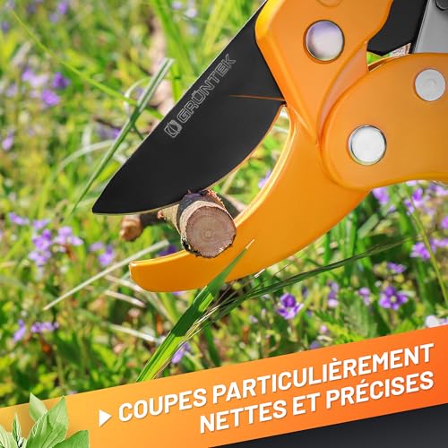 GRÜNTEK Sécateur de Jardin professionnel à Crémaillère. Cisaille à Haies Coupe Branches à Cliquet Automatique Ø24 mm