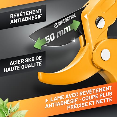 GRÜNTEK Sécateur de Jardin Professionnel à Crémaillère. Cisaille Coupe Branches à Cliquet Manuel et Automatique